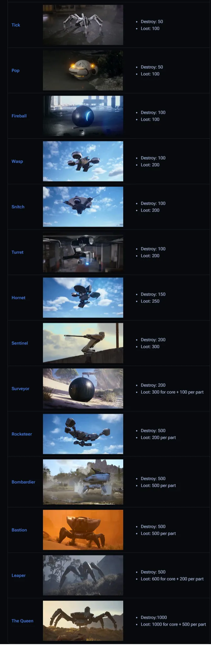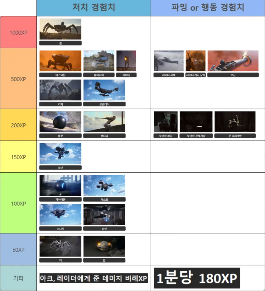 표를 보시면 생각보다 레이더 , 아크를 잡는 게 XP적으로 효율적이지 않다는 게 보이실겁니다.