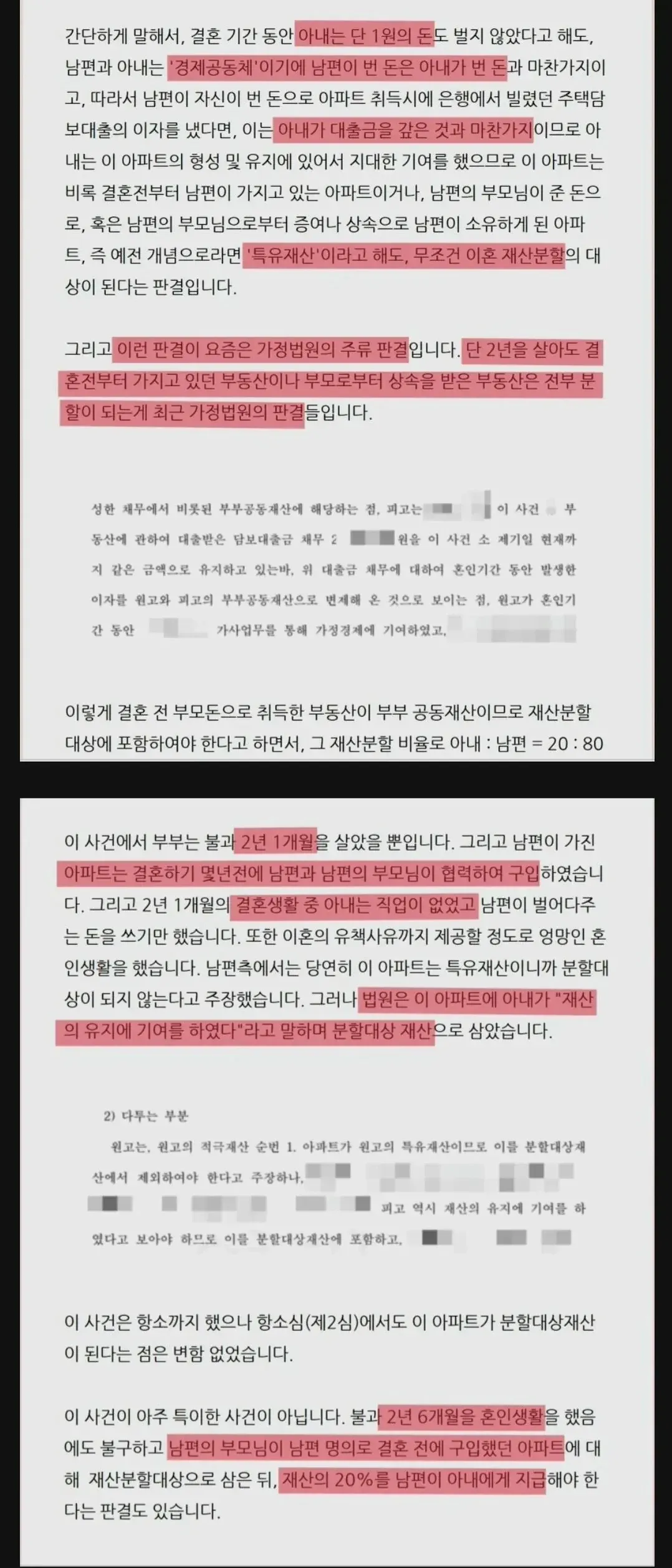 비율은 8:2, 분할 근거는 아내는 경제활동을 하지 않았고 특유재산에도 돈을 보태지는 않았지만, 남편의 월급 중 일부를 이자로 냈다면 아내는 재산의 형성, 유지에 지대한 공헌을 했다고 인정해야하기 때문