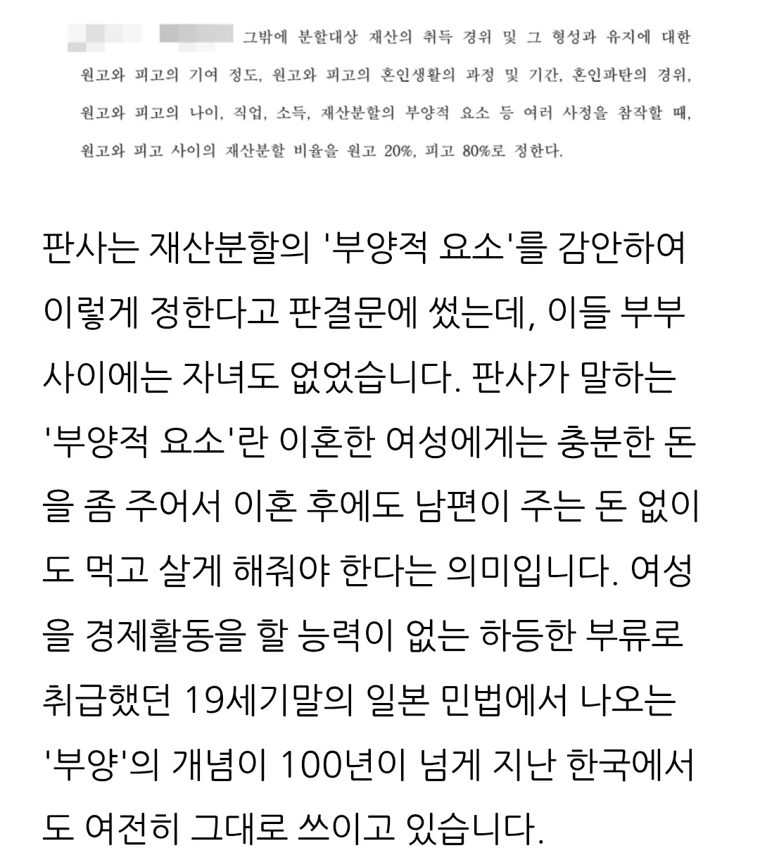 더 정확히 말하면 여성에게 경제권이 없던 19c 일본 민법의 '부양적 요소'라는 개념을 21c 한국 법원에서 차용 중이기 때문임
