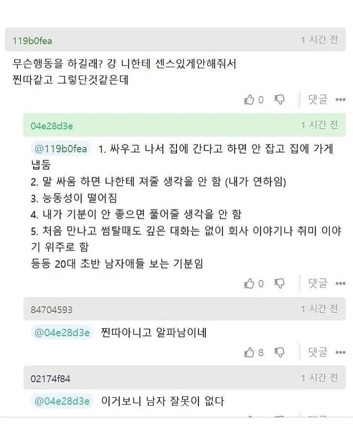 솔플마스터 1개월 전 2025-10-29 00:50:45 남친 연애 횟수 듣고 현타온 익붕이 남친이 진짜 알파남이라서 저러는 거임 갑이니까 여자 비위 맞출 필요가 없거든 첨부파일 2 image.png.webp 51.1KB 1 image.png.webp 39.6KB 3
