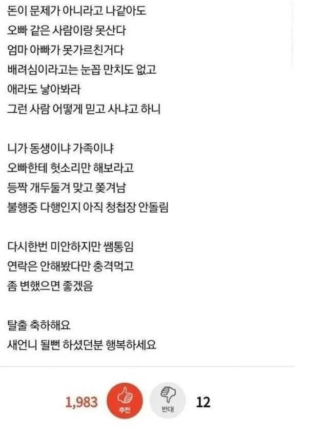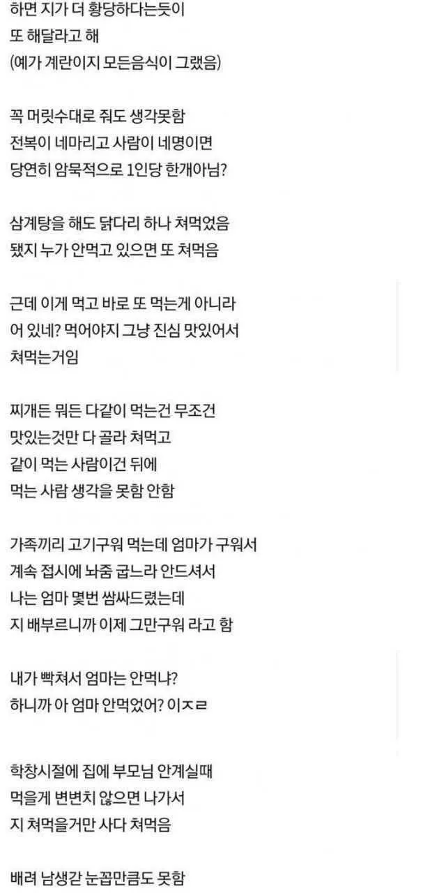 저런 이기적인 성격은 고칠수가없음 평생 저러고 살아와서 자신의 행동이 뭐가 잘못된건지도 모름 저런사람은 거울치료로 똑같이 당해봐도 자신의 행동이 잘못된것이구나 느끼는게 아니라 상대방만 욕할놈임 그냥 혼자사는게 답임