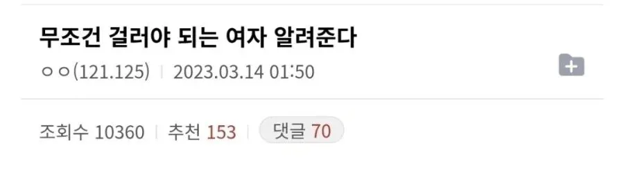 솔플마스터 30일 전 2025-10-31 13:08:45 무조건 걸러야 되는 여자 알려 준다 이건 일차적인 해결만 될뿐 '해줘'가 패시브고 고마워할줄 모르는 사람이라는게 포인트일듯 첨부파일 2 image.png.webp 8.6KB 3 image.png.webp 84.8KB 3
