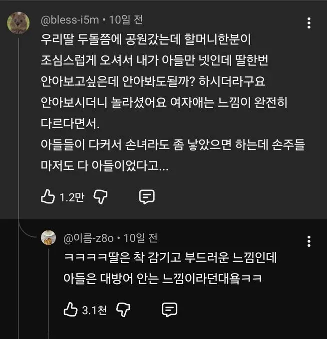 솔플마스터 4일 전 2026-01-28 11:16:57 딸이랑 아들 촉감차이 진짜 아들내미는 뭔가 뻣뻣하게 펄떡펄떡 거리는 느낌임 첨부파일 1 image.png.webp 36.0KB 1