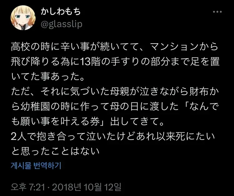 둘이서 서로 껴안고 울었고 그 이후로는 죽고 싶다고 생각한 적은 없어