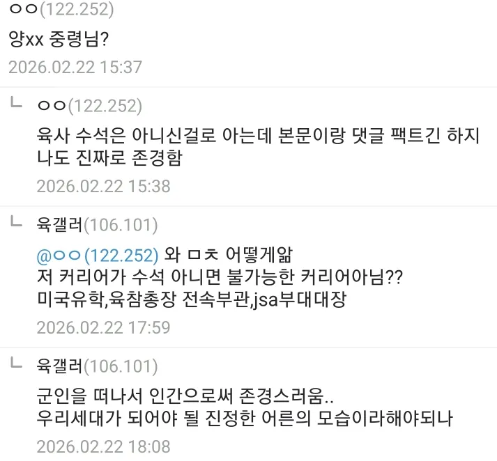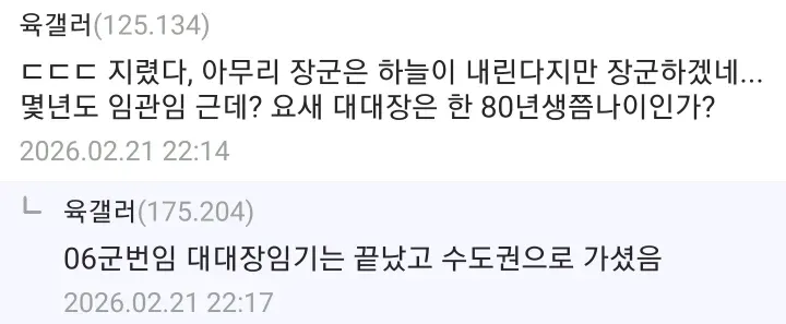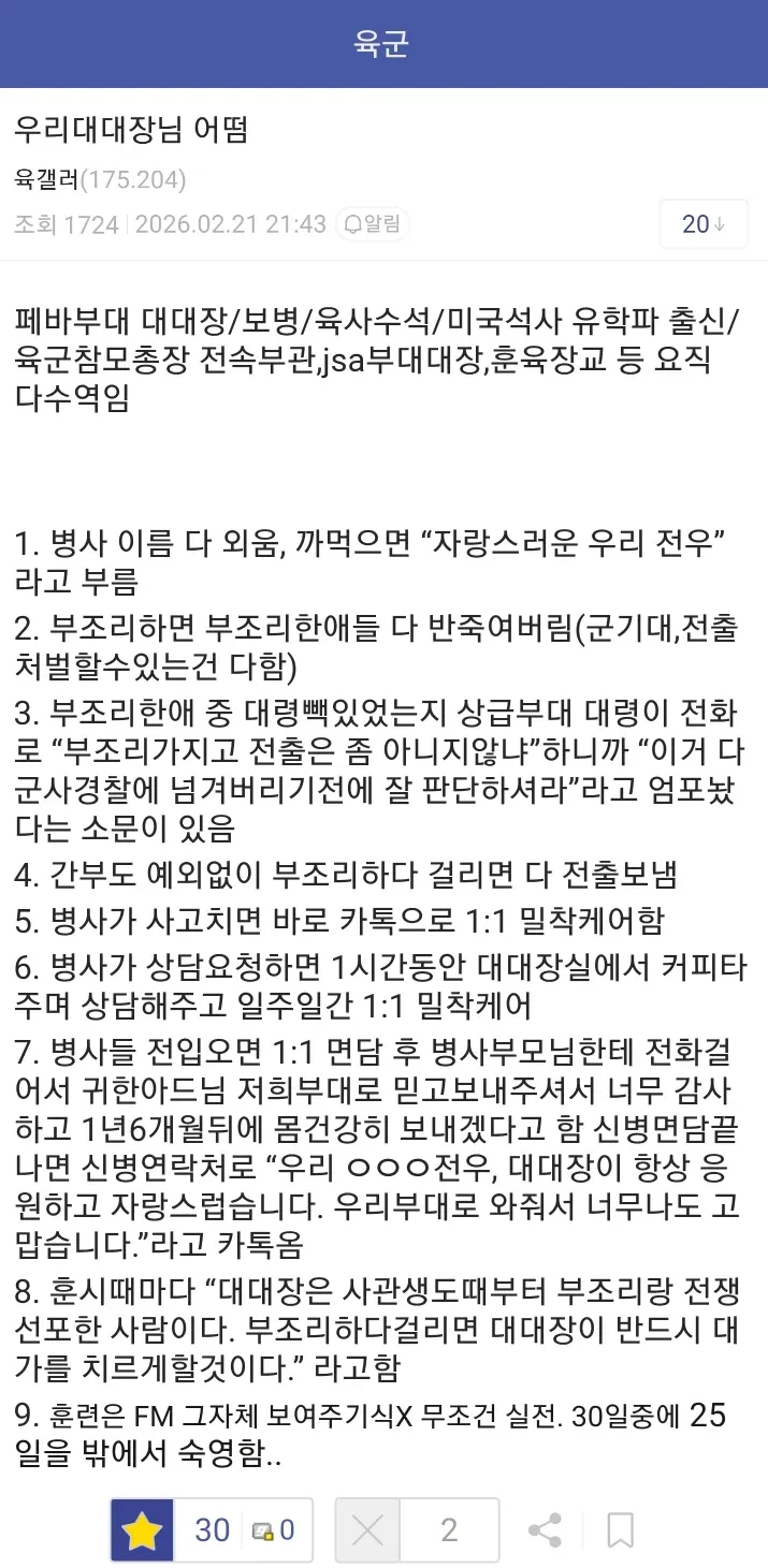 솔플마스터 2시간 전 2026-02-25 17:46:37 우리부대 대대장 FM인데 어떰? 저런분 밑에서 구르면 느낌이 딱 옴 이 양반은 분명히 별 단다 첨부파일 4 image.png.webp 99.3KB 0 image.png.webp 16.8KB 0 image.png.webp 18.4KB 0 image.png.webp 31.5KB 0