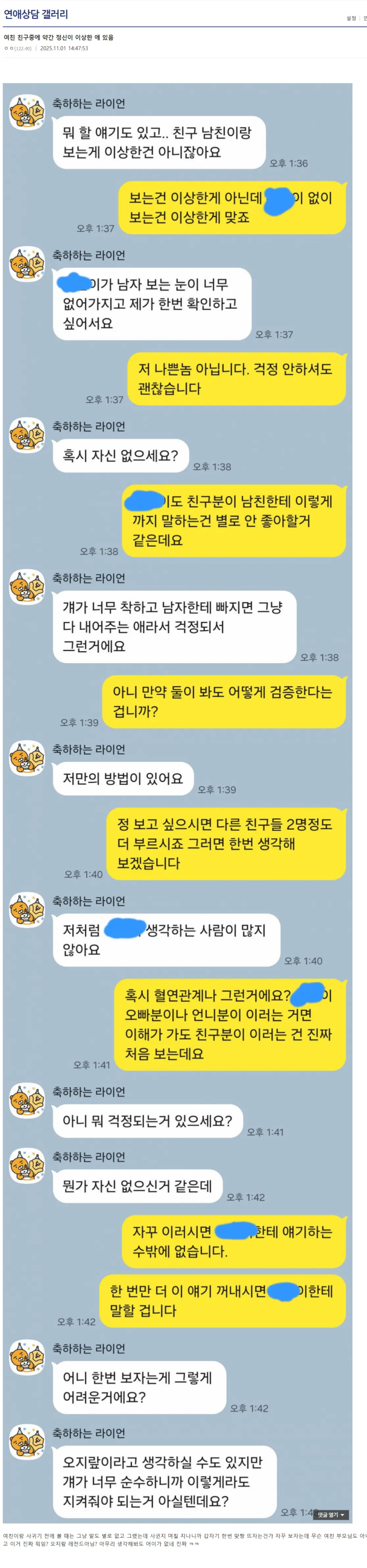 솔플마스터 29일 전 2025-11-01 19:52:21 여친 친구의 오지랖 자기가 보고 괜찮은 남자면 옆에서 가스라이팅해서 헤어지게 만들려는듯 첨부파일 1 image.png.webp 205.1KB 3