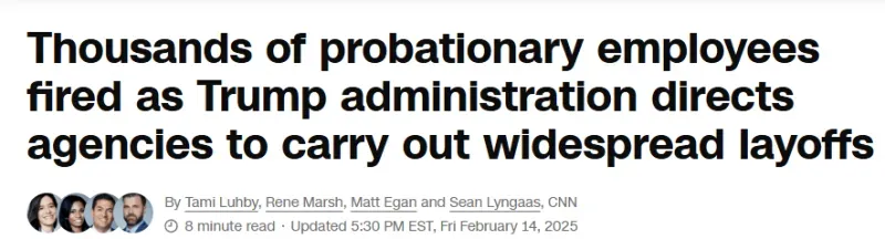 트럼프가 14일에 미국 내무부, 에너지부, 보훈부, 농무부, 보건복지부 등 공무원들 1만명 가까이 해고해서 난리가 났습니다.