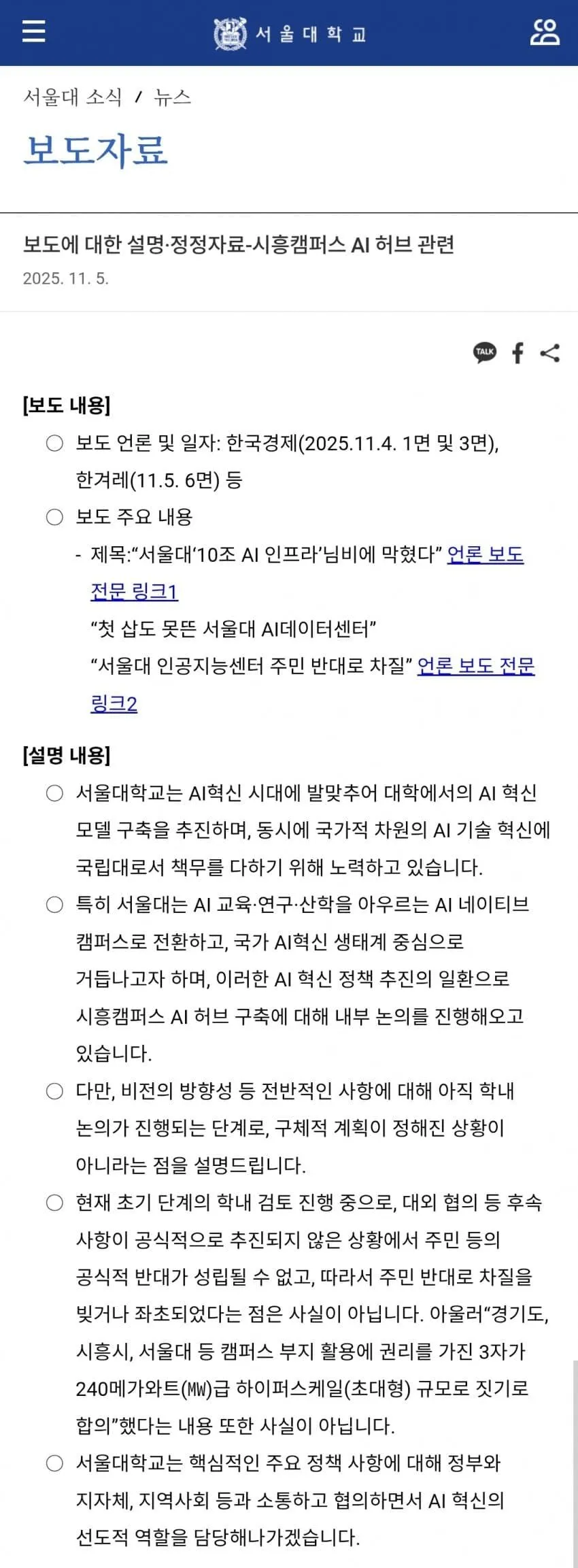 서울대에서 사실이 아니라고 반박함