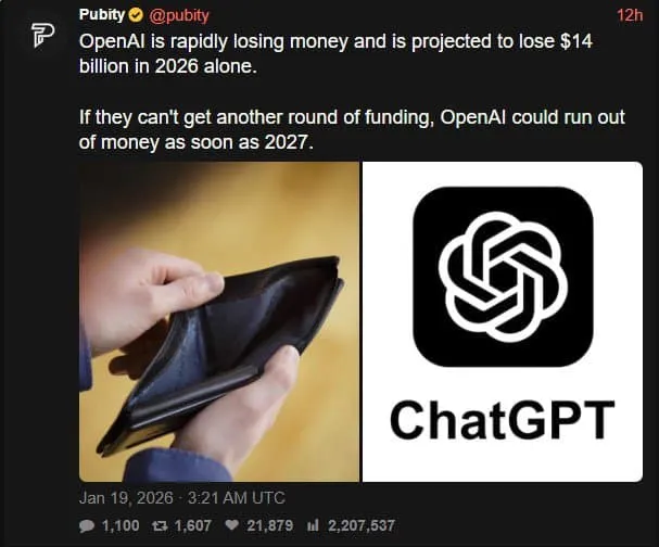 솔플마스터 12일 전 2026-01-20 11:20:18 오픈AI.. 18개월 내 파산 가능성 올해 적자 18조원 예상이고 2027년에 자금고갈로 파산할 가능성 있다고함 첨부파일 2 image.png.webp 50.9KB 3 image.png.webp 25.5KB 2