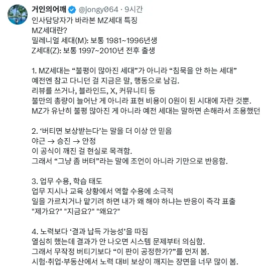 솔플마스터 4일 전 2026-01-28 13:50:21 인사담당자가 바라본 요즘 MZ세대 특징 흐음... 그렇군... 첨부파일 2 image.png.webp 40.6KB 1 image.png.webp 47.2KB 1