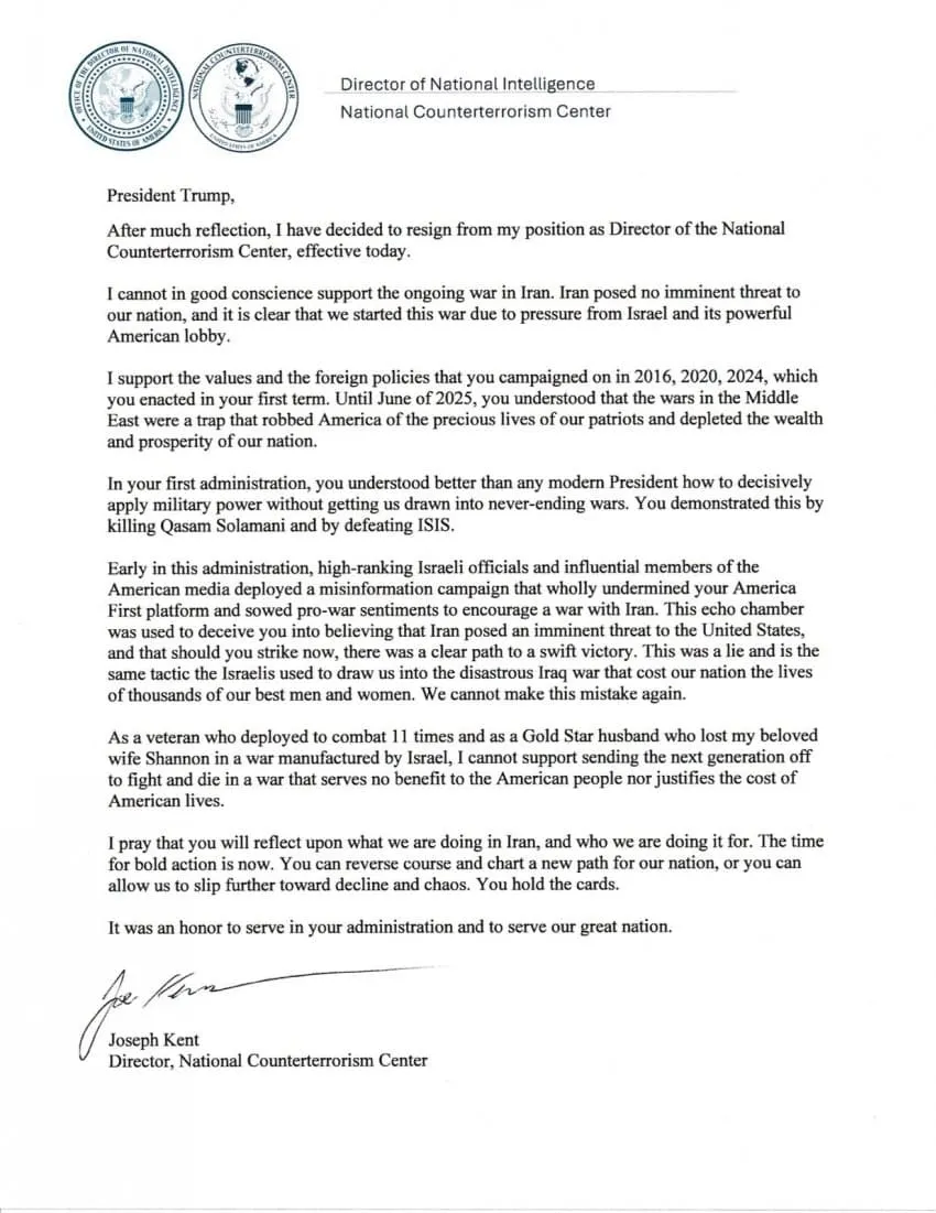 오랜 숙고 끝에, 저는 국가대테러센터장 직에서 오늘부로 사임하기로 결정했습니다.