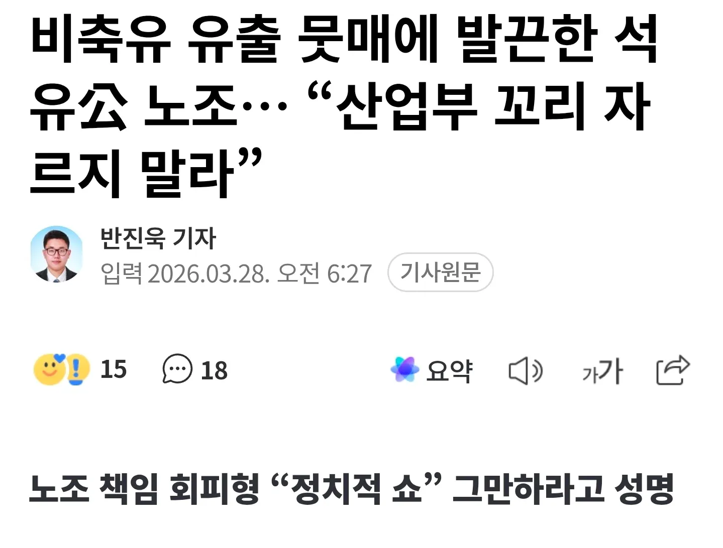 90만 배럴이 뿅하고 사라져서 한국석유공사에 특별 감찰을 한다는 소식에 노조가 개빡침.