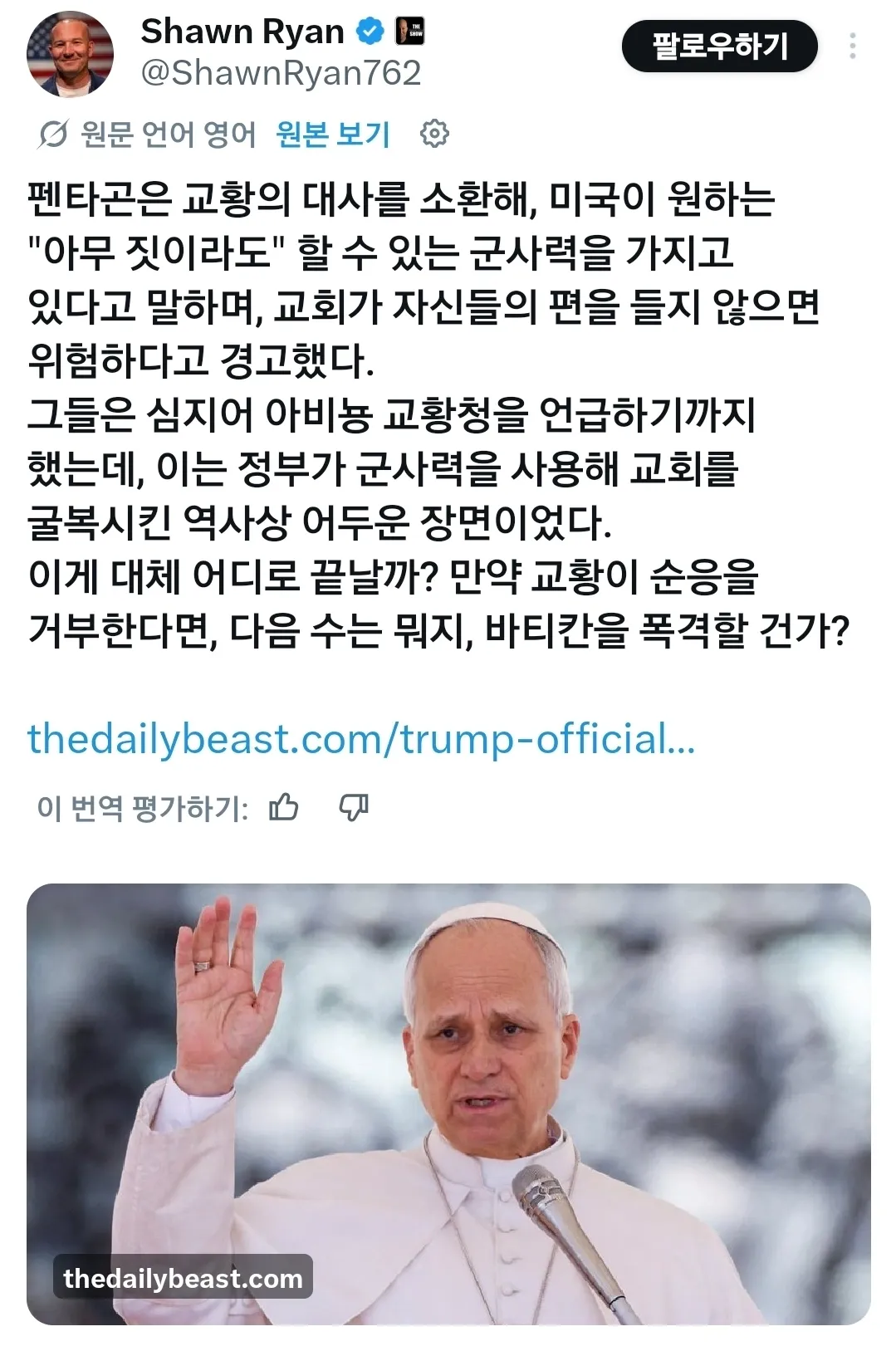 솔플마스터 2시간 전 2026-04-10 12:22:28 미 국방부 “바티칸에 미군 투입해서 교황청 통제할 수 있다” 내가 지금 뭘 본거지? 설마 가짜 뉴스겠지... 씨X 이게 왜 진짜야? 첨부파일 3 image.png.webp 43.0KB 0 image.png.webp 46.3KB 0 image.png.webp 101.3KB 0
