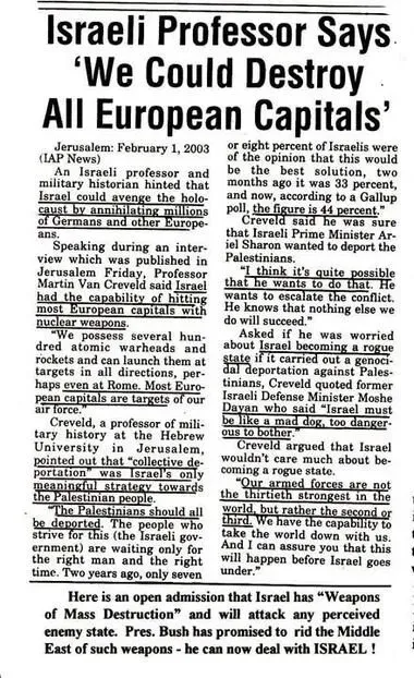 그러니까 보유한 핵미사일을 유럽과 아랍을 포함한 모두에게 핵을 쏴버리겠다는 미친 전략을 핵개발 이후 유지중이란 소리.