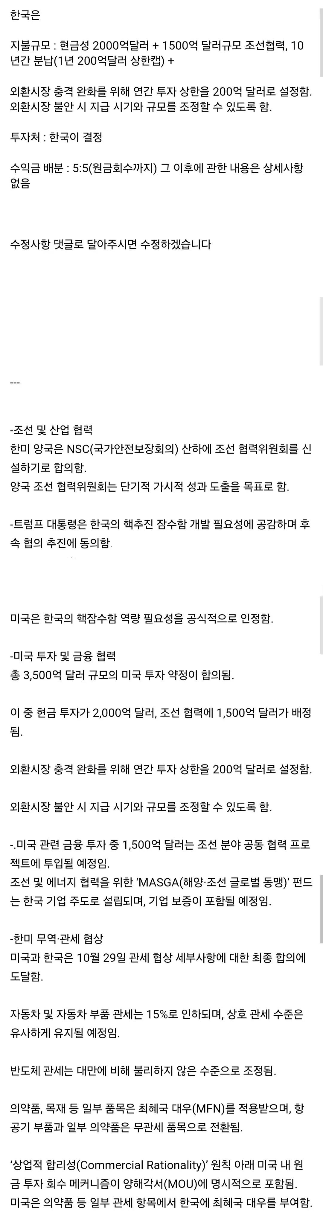 솔플마스터 1개월 전 2025-10-29 22:51:36 한미 관세협정 정리본 진짜 이정도면 선방한거 같다. 거기다 핵잠연료 언급한거도 크고.. 첨부파일 1 image.png.webp 189.0KB 2