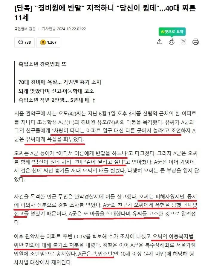 1. 70대 경비원이 11살 초등학생들에게 아파트 입구말고 다른데서 놀라고 함.