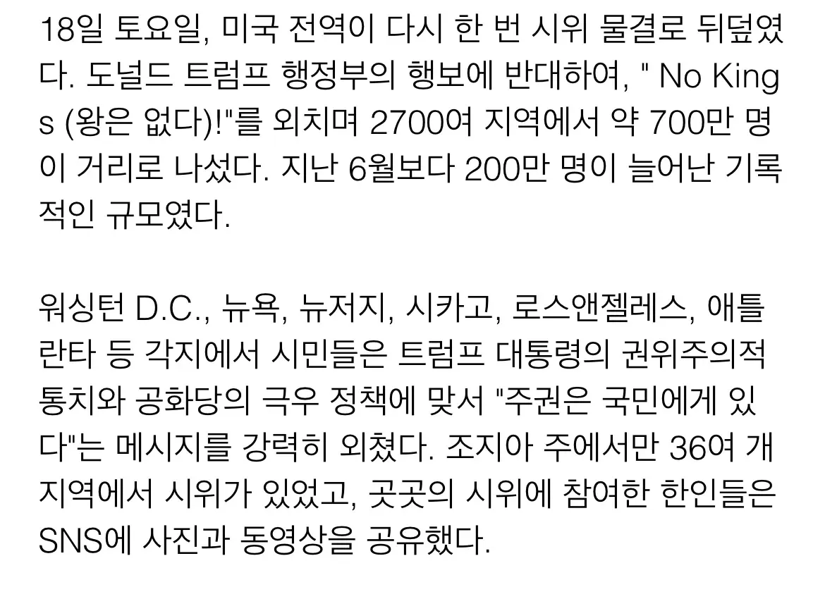 최근 미국에서는 트럼프의 권위주의적 행보에 반대하는 "왕은 없다(No kings)" 시위가 일어나고 있음..