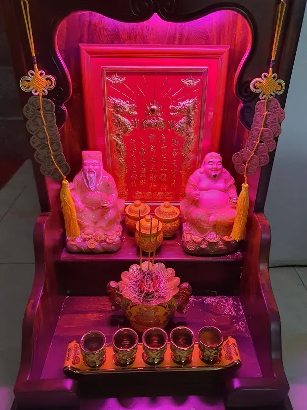 종교에 상관없이 집이나 회사, 매장에는 조그만 불단을 차려 놓습니다. 그리고는 아침 저녁으로 향을 피우면서 기도를 하죠. 이 조그만 불단은 설치된 장소의 구성원들을 수호하거나 설치된 장소에 좀더 많은 재물이 들어오기를 기원하는 겁니다.